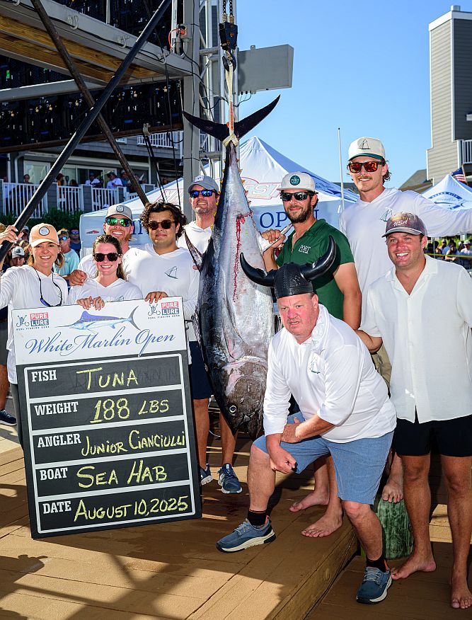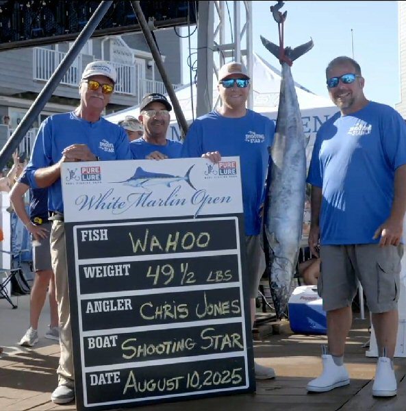Sunday – Nearly every boat that still had a fishing day left went out for one last attempt at a big catch. 211 boats went out – and nearly as many fish were brought to the scales on Sunday as in the first six days of fishing. There were non-qualifying white marlin, tuna and dolphin. Then the Sea Hab from Cape May arrived with a 188 pound bluefin tuna – followed later in the afternoon by Ocean City’s Shorebilly and a 186.5 pound bluefin. Finishing out the day at the scales – the arrival of the Shooting Star from Indian River and the only wahoo caught and weighed in the White Marlin Open – a 49.5 pound qualifier.