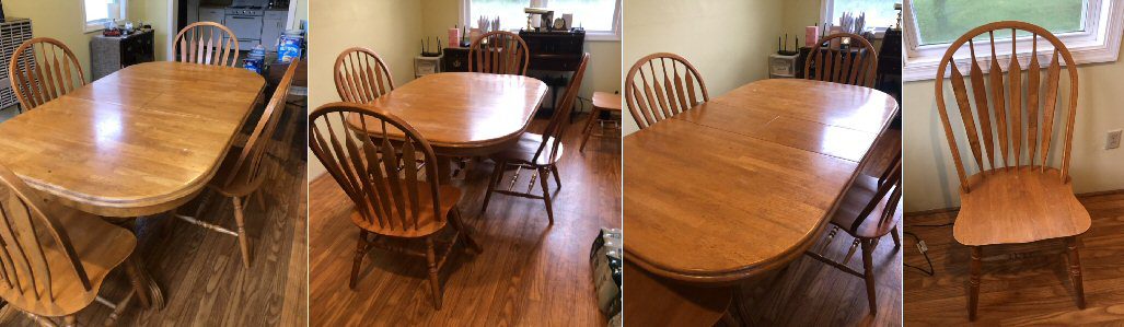 DESCRIPTION: Light brown stained oak table with 6 chairs. The table has 2 built-in leaves that extend to 5 and 7 feet. In good condition.
