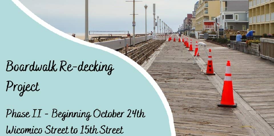 After Sunfest exits Ocean City on Sunday, Phase 2 of the boardwalk re-decking project will get underway. This project will focus on the boardwalk from Wicomico Street to 15th Street. Benches, trash cans and other items will be removed from the east side of the boardwalk and pedestrian and bike traffic may be diverted. This…