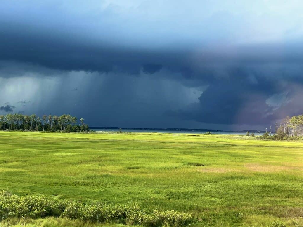 Dave Nelson – Ocean View – Sun on the salt marsh and rain on Indian River Bay. Click for full view