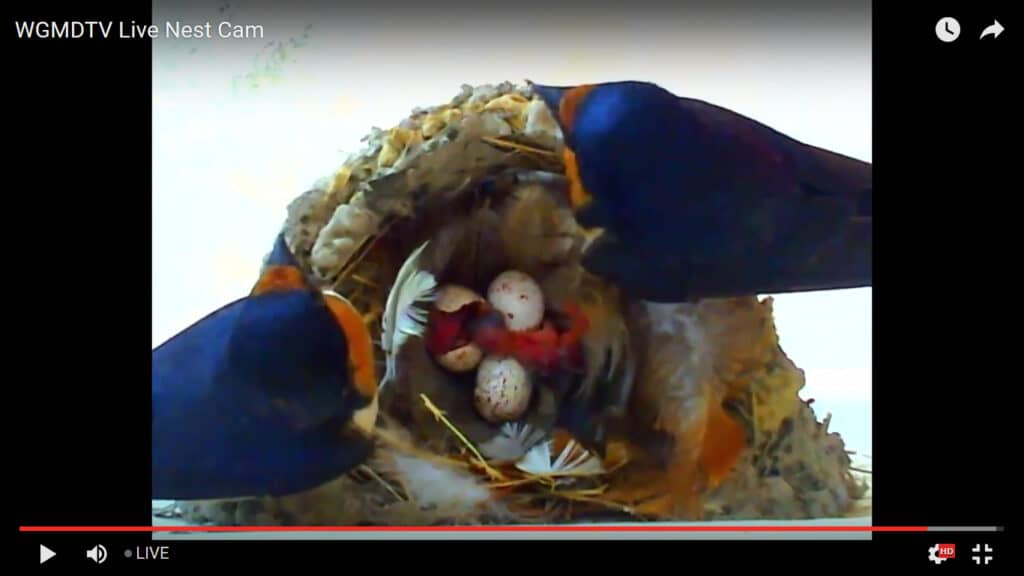 WGMD Throwback Thursday Picture of the Day – going back to 2016. After our visiting barn swallows returned – we put a live camera over the nest to watch the progression of the building and the babies and caught the first baby hatching from the eggs – with the proud parents watching over them. Most years the birds have built their nest on top of our security cameras on the porch. While we’ve spotted the swallows a couple of times last month – no one looks to be building on the cams this year. Wonder if they’ll return for the summer of ’22? Click for full view