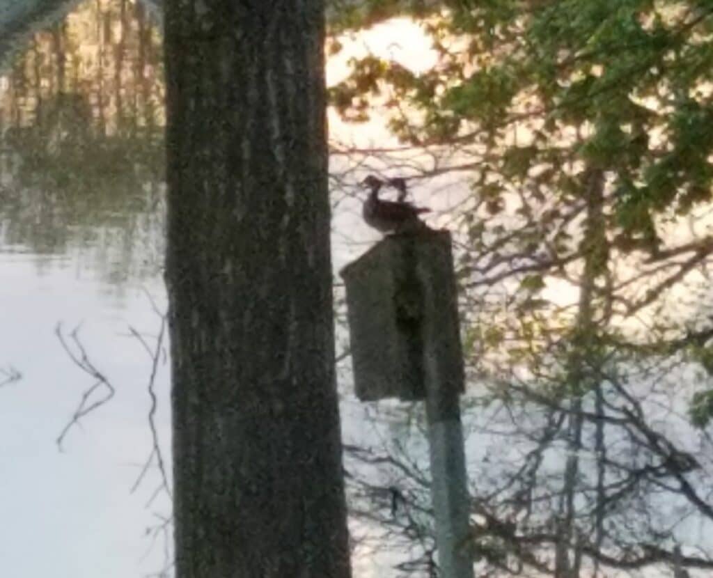 Margaret May – Lewes – Wood ducks on the nesting box at Red Mill Pond / Click for full view