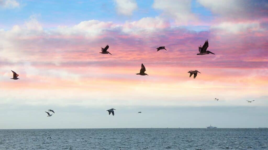Red Moulinier – Rehoboth Beach – Pelicans off Cape Henlopen Point at Sunset / Click for full view