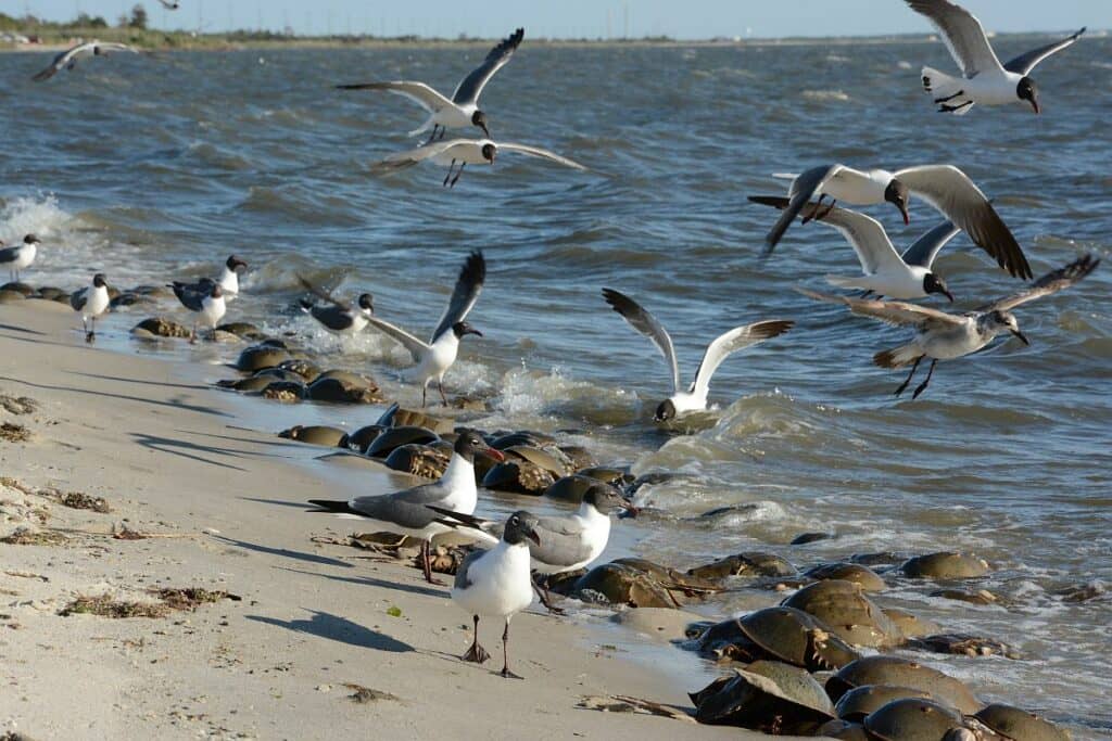 Barb Moulinier – Rehoboth Beach – Horseshoe crabs and gulls at the Rehoboth Bay / Click for full view
