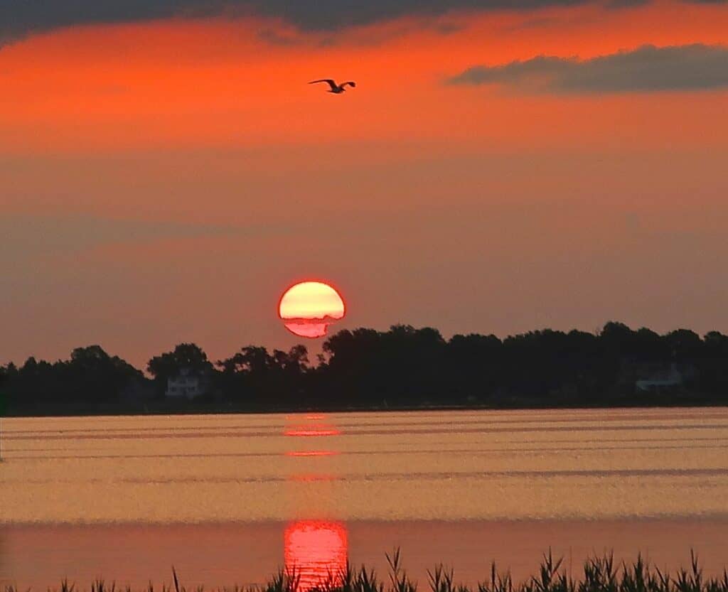 Dave Nelson-Ocean View – Gull Above Sun Rising Over Indian River Bay / Click for full view