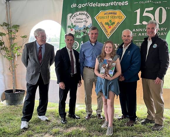 In celebration of Arbor Day and the state’s A Tree for Every Delawarean Initiative, Arbor Day Poster contest winners from elementary schools around the state planted eight trees today on the Rehoboth Elementary School campus. The native, locally sourced trees planted include three oaks, two hophornbeams, two redbuds, and a sycamore.
