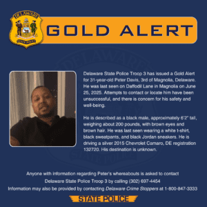 Delaware State Police Troop 3 has issued a Gold Alert for 31-year-old Peter Davis, 3rd of Magnolia. He was last seen on Daffodil Lane in Magnolia on June 25th. Attempts to contact or locate him have been unsuccessful, and there is a concern for his safety and well-being. He is described as a black man, approximately 6’2 and weighing about 200 pounds–with brown eyes and brown hair. He was last seen wearing a white t-shirt, black sweatpants, and black Jordan sneakers. He is driving a silver 2015 Chevrolet Camaro with Delaware registration: 132720. His destination is unknown. Anyone with information on where Davis is should contact State Police Troop 3 at 302-697-4454 or Crime Stoppers at 1-800-847-3333.