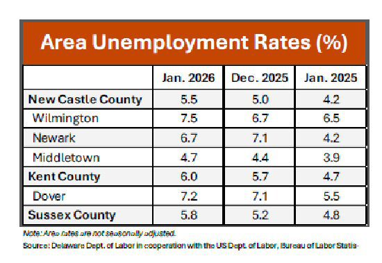 According to the January Labor Review, there were 27,900 unemployed Delawareans in January compared to 21,300 in January of 2025. The largest over-the-year job increase from January 2025 to January 2026 was in the Private Education and Health sector, followed by Construction while the Leisure & Hospitality Sector showed the largest over-the-year decrease.