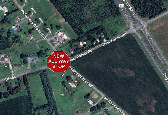 DelDOT will convert a 2-way stop into an All Way Stop on Tuesday at the intersection of Deer Forest and McColleys Chapel Roads west of Georgetown.