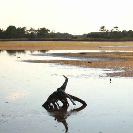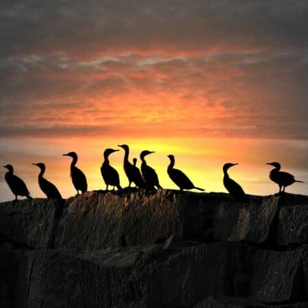 Click For Full View Barb Moulinier - Rehoboth Beach - Birds on the rocks at sunset on the Delaware Bay