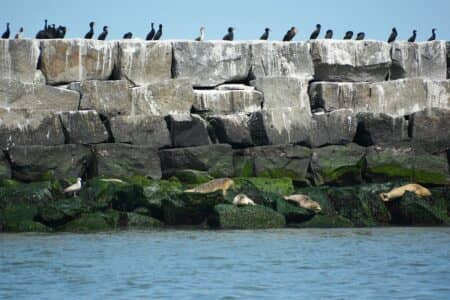 Barb Moulinier - Rehoboth Beach - Harbor Seals on Outer Breakwater wall with Cormorants on top of wall, taken on seal cruise... Barb Moulinier - Rehoboth Beach - Harbor Seals on Outer Breakwater wall with Cormorants on top of wall, taken on seal cruise