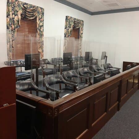 ML - Delaware courts are getting ready to restart jury trials in June - and crews have been busy making the courtrooms safer for everyone taking part. If you'r... ML - Delaware courts are getting ready to restart jury trials in June - and crews have been busy making the courtrooms safer for everyone taking part. If you're called for jury duty - you will be socially distanced in Courtroom #1 in Georgetown. The the jury members chosen will hear the trial in Courtroom #2. Each juror will be separated by plexiglass. The witness box, judge's bench, staff seats and the attorneys are also separated by plexiglass and anyone sitting in the gallery will be socially distanced as well.