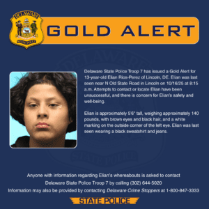 Delaware State Police Troop 7 has issued a Gold Alert for 13-year-old Elian Rios-Perez of Lincoln. Elias was last seen near North Old State Road in Lincoln on October 16th at 8:15 a.m. Attempts to contact or locate Elian have been unsuccessful, and there is concern for Elian’s safety and well-being. Elian is about 5’6 and weighing about 140 pounds, with brown eyes and black hair and a white marking on the outside corner of the left eye. Elian was last seen wearing a black sweatshirt and jeans. Anyone with information on Elian’s whereabouts should contact State Police Troop 7 by calling 302-644-5020.