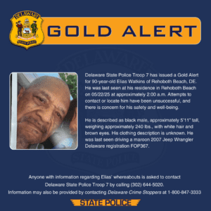 Delaware State Police Troop 7 has issued a Gold Alert for 90-year-old Elias Watkins of Rehoboth Beach. He was last seen at his home in Rehoboth Beach overnight May 22nd around 2:00 a.m. Attempts to contact or locate him have been unsuccessful, and there is concern for his safety and well-being. Watkins is described as a black man, 5’11 tall, and weighing about 240 pounds with white hair and brown eyes. His clothing description is unknown. He was last seen driving a maroon 2007 Jeep Wrangler with Delaware registration FOP367. Anyone with information on the whereabouts of Elias Watkins should contact Troop 7 at 302-644-5020.