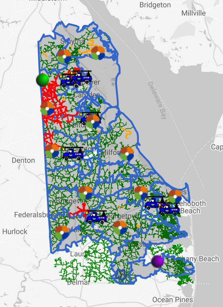 Delmarva Power and Delaware Electric Cooperative reported thousands of outages many thanks to downed wires and wind. Many outages were along the MD / DE state line from Seaford to Greenwood as well as the Coastal Club Community west of Lewes. In Kent County there were many outages along the state line from Sandtown north to Marydel (the big patch of red on the map).