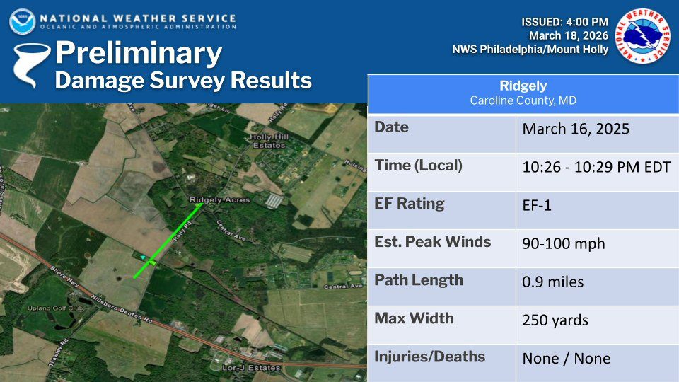 Earlier Tuesday the survey team confirmed a tornado occurred Monday evening in Ridgely, Maryland in Caroline County. The preliminary rating of this tornado is an EF-1 with maximum winds to 100mph.