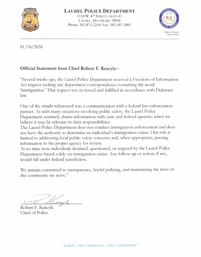 The Laurel Police Department recently received a Freedom of Information Act request for correspondence that contained the word ‘immigration.’聽 Laurel Police Chief Robert Kracyla released the following statement:聽