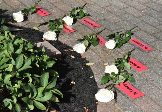 Ms. Feeney presented a white rose to the families of the JMB Memorial Garden’s first three honorees as well as to its six newest honorees. Principal Dr. Christel Savage provided closing remarks, thanking everyone who made the 25th anniversary rededication of the garden so meaningful and pledging the school’s continued commitment to preserving the Memorial Garden as a place for reflection. She thanked JMB alumnus Bruan LeCompte for his volunteer upkeep efforts in the garden.