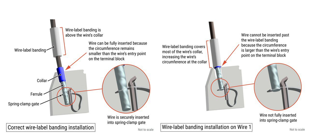 Illustration showing how placement of wire-label banding affects the way wires are seated in their terminal blocks. (Source: NTSB)