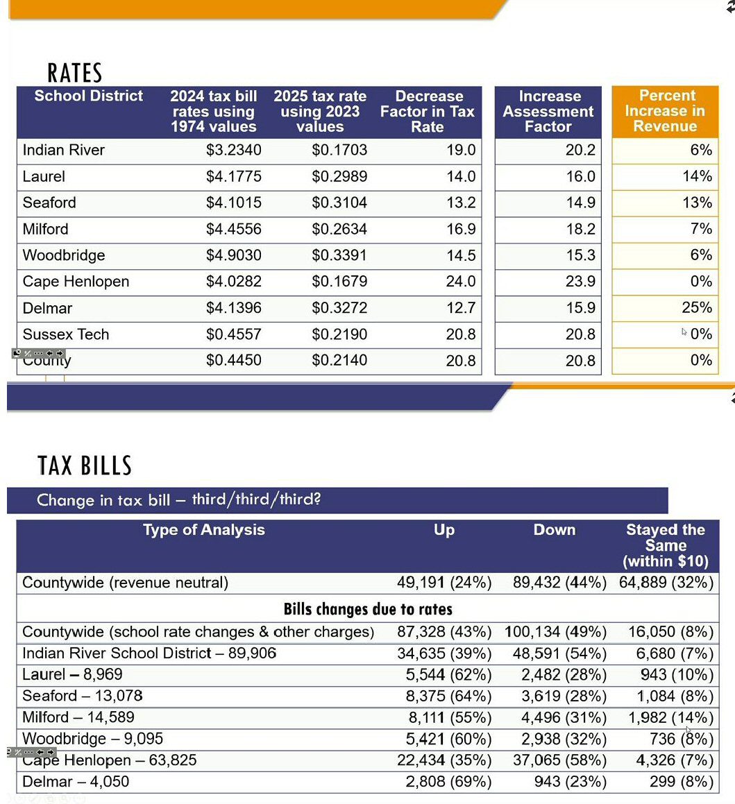 County Finance Director Gina Jennings gave the Council an overview of the 2025 Tax Billing and how bills will be affected by the reassessment that was completed in the spring. Jennings says that reassessment will not delay the release of the county tax bills – they will be in the mail at the same time as every year – and arriving in your mail box in early August. The county’s portion of the tax was done to be revenue neutral, so that there would be little change in your tax – just the tax rate, which is much lower. Jennings says that before school taxes are included, about 44% of County residential properties will see a decrease in their tax bill. For most – it will depend on the school districts. Only Cape Henlopen remained revenue neutral. The other districts in Sussex County opted for at least some of the allowed increase of 10% that was permitted through the reassessment legislation. Jennings says the tax calculator has been updated to work with your reassessed property value and your school district to give a closer idea of your taxes. That calculator will be replaced after about a week with an actual calculator that will show the impact of your taxes on individual property.