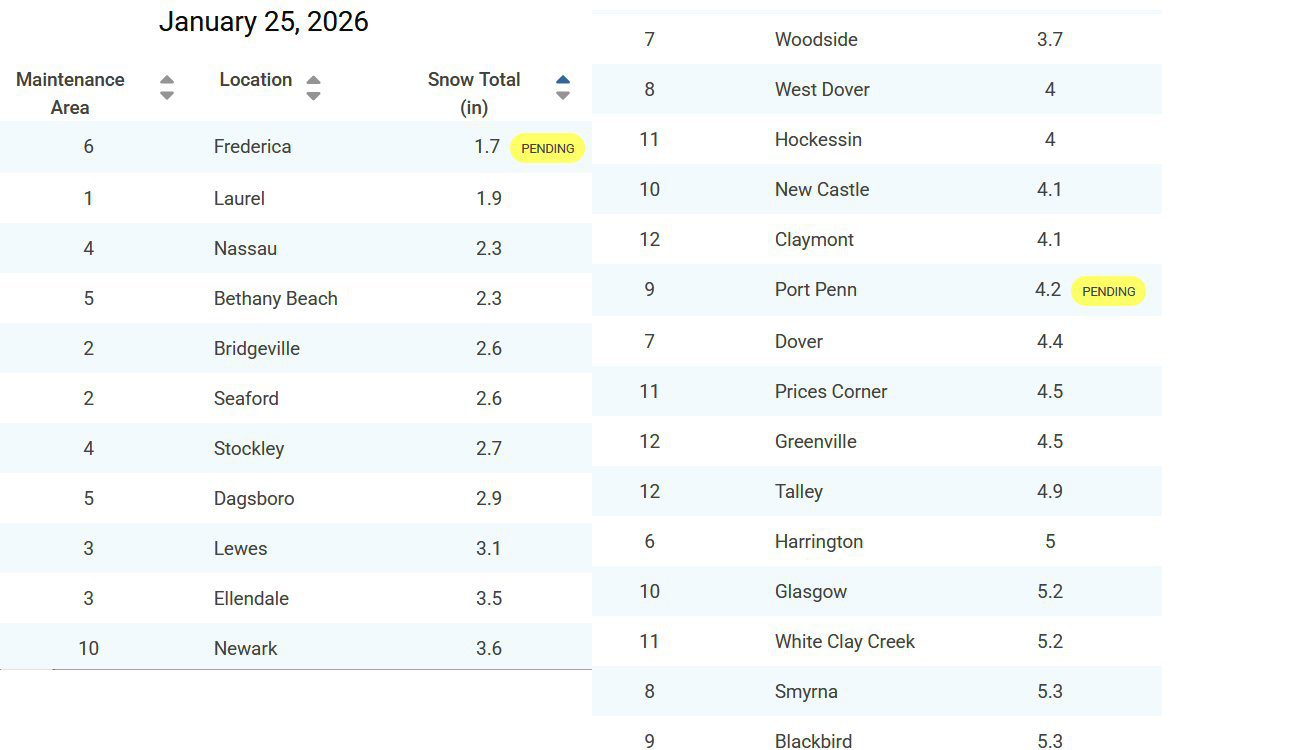 The snow began falling just after midnight – New Castle County and Kent County have seen the highest snowfall as of 10am. Kent and New Castle Counties saw enough snow and cold temperatures for the Driving Restriction Level to be increased there to Level 2, while Sussex County remained at Level 1.