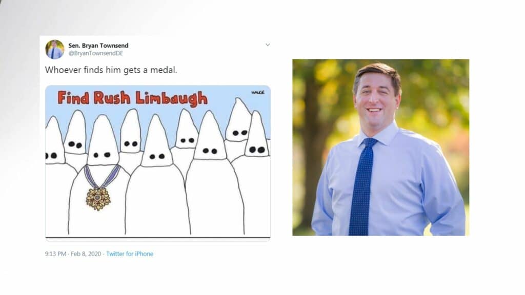 Delaware State Senator Bryan Townsend has come under fire for sharing a callous meme on Twitter of Ku Klux Klan (KKK) members that read, “Find Rush Limbaugh.” Senator Townsend shared the illustration, or meme, Saturday evening on Twitter attacking Rush Limbaugh, who recently received a diagnosis of advanced lung cancer and was presented the Presidential…