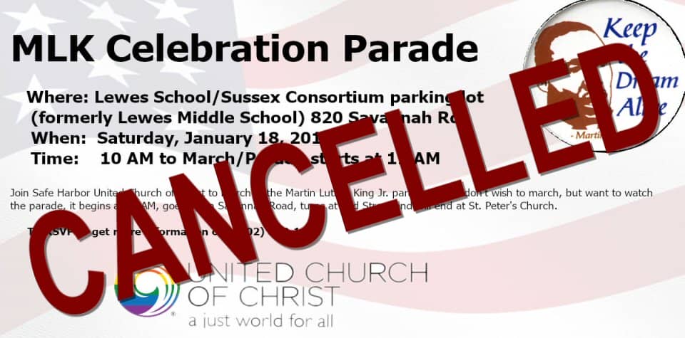 The Martin Luther King Jr, Parade in Lewes today hosted by the United Church of Christ has been cancelled. Line up was to begin at 10am at the Lewes School/Sussex Consortium – with the parade stepping off at 11 this morning down Savannah Road.