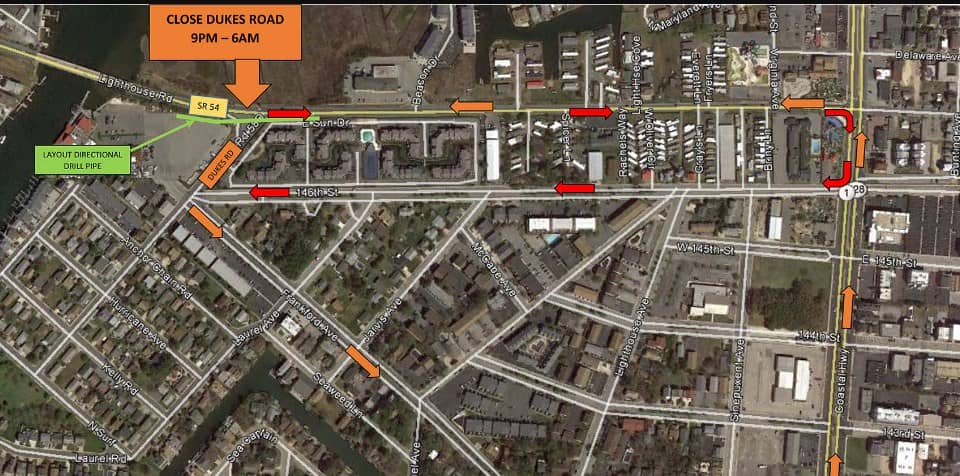 In Ocean City — Dukes Road will be closed from Route 54 to 146th Street from Wednesday night into Thursday morning. Officials say the road closure is needed so crews can perform horizontal directional drilling. The work will begin at 9 PM tomorrow night and wrap up by 6 AM Thursday morning.