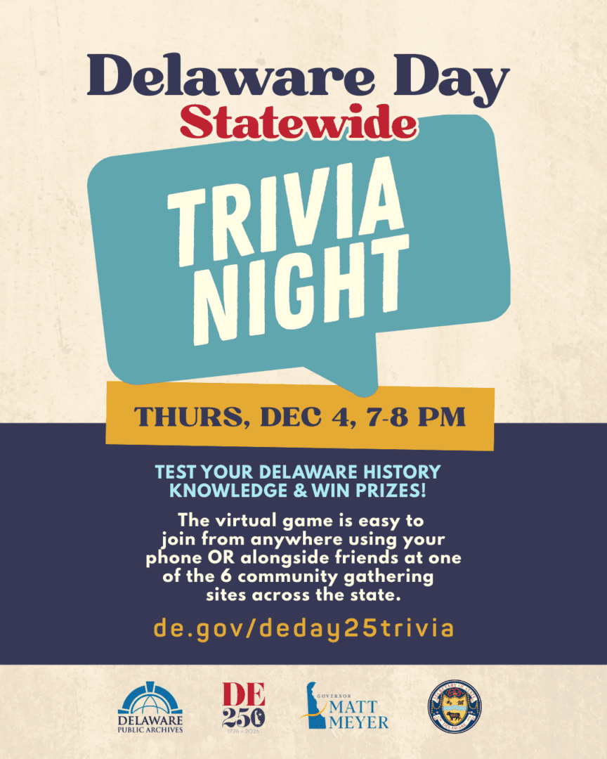 Delaware Day Trivia Night will take place tomorrow– Thursday, December 4, from 7–8 p.m., with participants age 18 and older able to play from home or at six gathering sites statewide. Governor Matt Meyer and Secretary of State Charuni Patibanda-Sanchez will host a live Matt Chats broadcast during the event, which will stream on state social media…