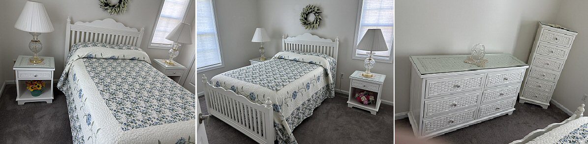 DESCRIPTION: White, includes 2 dressers, 2 night tables w/ table lamps, double bed frame with mattress.