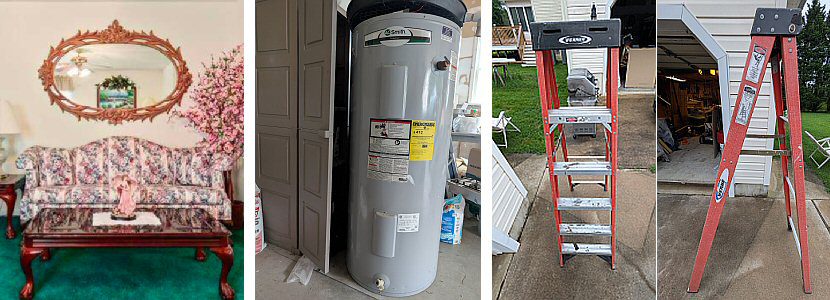 Large Antique Mirror-German / Hot Water Heater-55 gal / Warner 6′ folding ladder