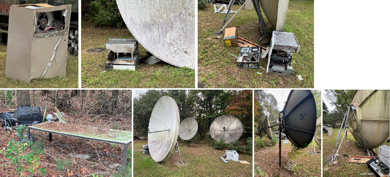 3 satellite dishes, 5 meters, with stands, Furnace, window A/C, assorted other metal products. About 800 pounds of scrap