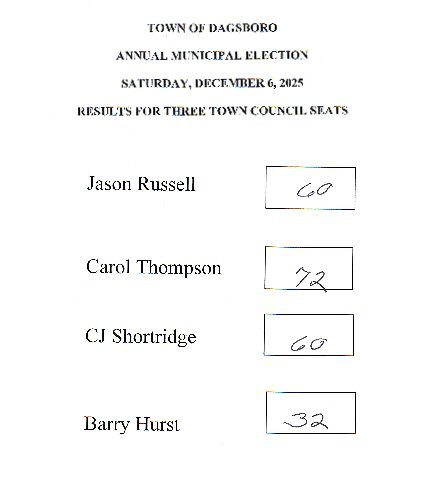 UPDATED – 12/07/25 – Dagsboro voters have returned all three incumbents to the town council for another two years. Carol Thompson was the top vote-getter with 72 tallies. Jason Russell and CJ Shortridge each won 60 votes and challenger Barry Hurst received 32 votes. Thompson, Russell and Shortridge will be sworn in at the December 15th meeting.