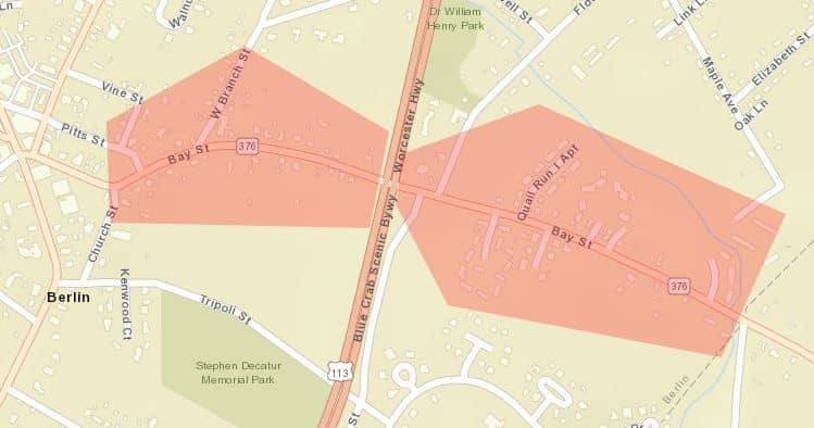 Berlin, Maryland residents – water service will be temporarily turned off for repairs overnight Monday, November 15 into Tuesday, November 16 from approximately 10:00 PM on Monday until approximately 5:00 AM on Tuesday. This will will affect addresses within the areas shown.