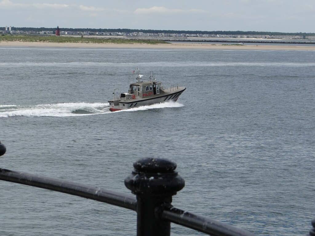 Red Moulinier – Rehoboth Beach – Pilot boat passing the Harbor of Refuge Light
