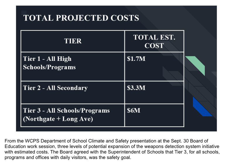The consensus of the Board of Education at its work session on Sept. 30 was that Board members agreed with the Superintendent that weapons detection systems are needed in all schools, programs and offices the public visits. The Board would like the Superintendent and his team to continue to move toward an expanded weapons detection system initiative by pursuing funding to put these systems in all schools, programs and offices that have visitors on a daily basis.
